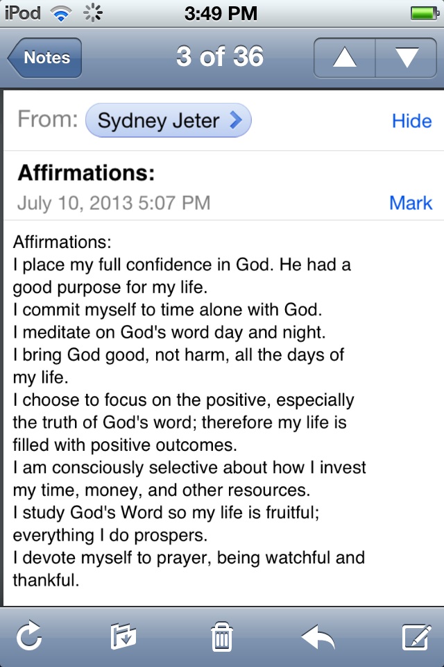 Moving into a New Year is not the same..I’m not excited I don’t want to celebrate because with every new year reality sets in and more time is added to my life that she isn’t a part of..If you’ve wondered how we are doing..We are surviving..we appreciate the blessings Gods given us we face the next day because we weren’t given a choice and we smile because as much as we don’t want to Cameron deserves nothing less and most of all we pray for peace and comfort from the only one who can provide it..I’m going to end by sharing my biggest blessing of 2014. You see I was having a really bad day missing Sydney and hurting because of lies regrding the accident and a few ppl saying awful things about Sydney..I couldn’t believe that I was walking through the loss of my daughter and now I was dealing with such evil from those who she thought loved her..I was in my flesh broken and not wanting to move wondering why God would add this burden on me after everything..I was screaming and crying on my bed..Satan had beaten me down I wanted to give up..quit..but at that moment I heard her voice whisper its ok Mommie I’ve given you everything you need..it touched me so much that at 10:46 am on June 3rd I tweeted it. I thought at that moment she was talking about all her other writings but at that moment as peaceful as I felt I still had no idea what God had truly waiting for me to find..then about 3:30 that afternoon I found the attached in a notes section on her phone under an email I hadn’t known about before..because she was using her phone the time and date she typed this was logged under her name..she typed this approximately 7 hours before she would be leaving me to spend eternity w/God himself. At 16 she took the time to stop and type these affirmations into her phone..all of her writings address something we have struggled with and have at times given us the strength to keep going but this one is by far the most profound being written just hours before the accident. I suffer everyday missing her but there is not a doubt in my mind EVER that she watches over me as I’m blessed with sharing her legacy smiling waiting until the day we are finally reunited! I’m forever blessed by the love and faith I see in her and I will wake up every single day hoping and praying to be someone that makes her as proud as she has made me. I love you Sydney Lisa Jeter forever and always
